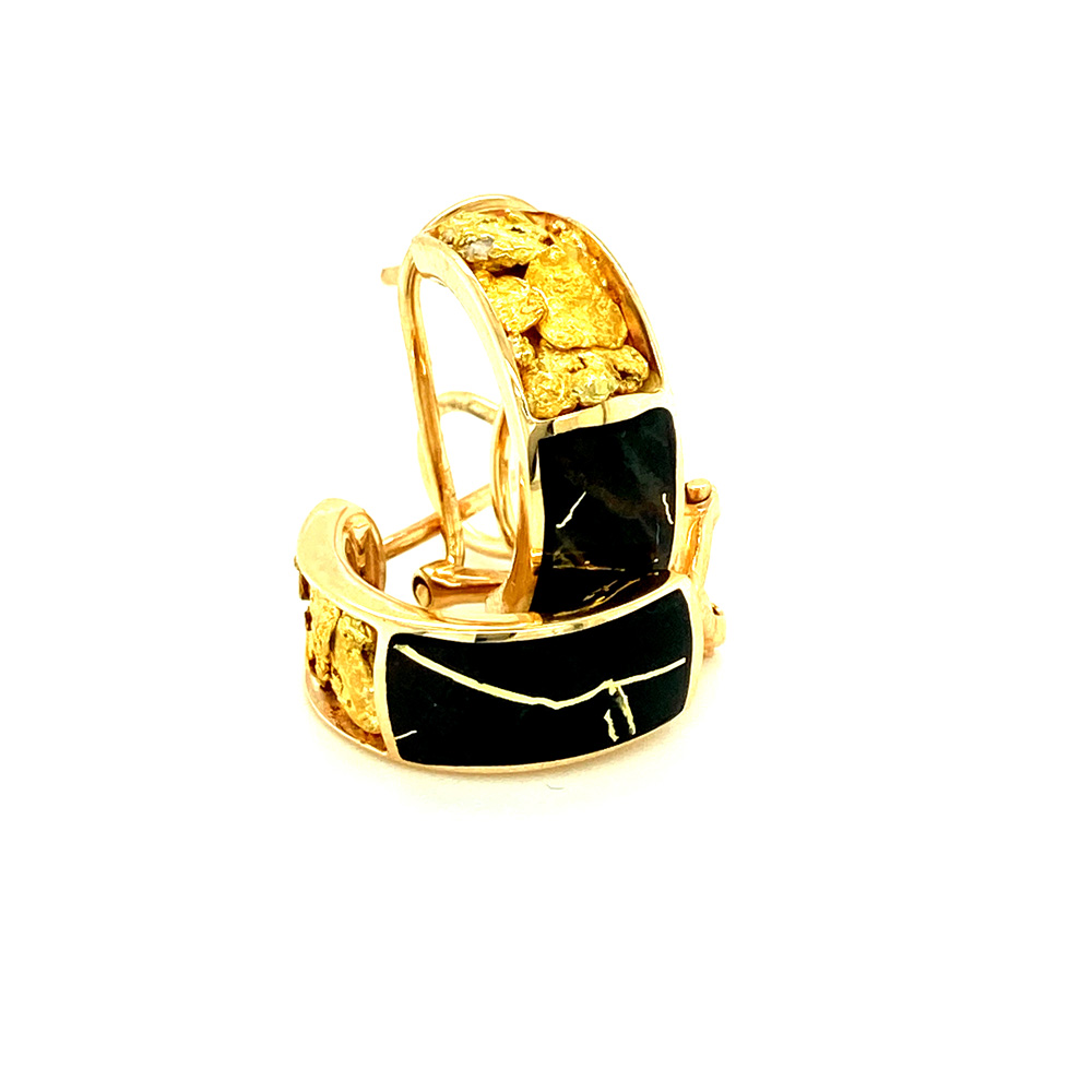 White Glacier Gold and Gold Nugget Earring Set In 14K Yellow Gold With Glacier Gold And Hand Soldered Gold Nuggets And 6 Side Round Diamonds Totaling 0.14CT
