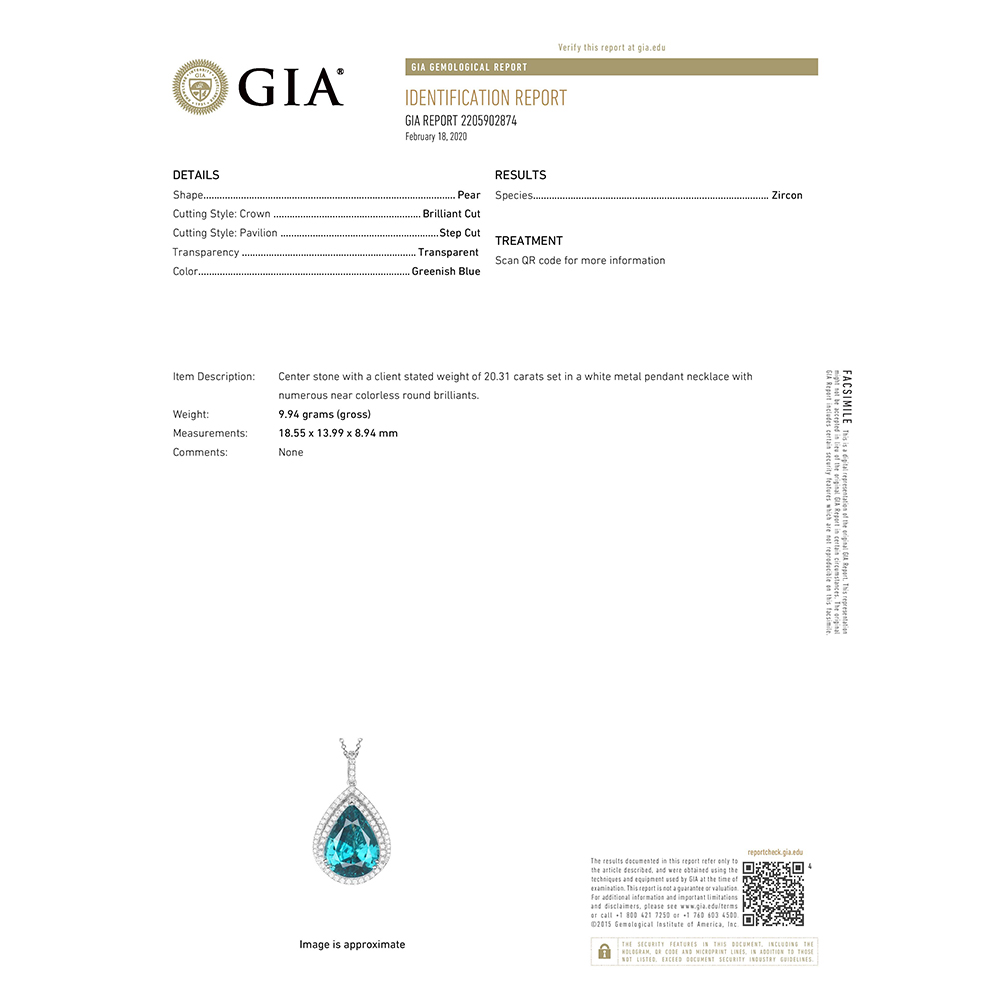 Blue Zircon Pendant Set In 14K White Gold With 20.31CT Pear Center Gemstone And Side Round Diamonds Totaling 0.69CT This Piece Comes With A GIA Certificate